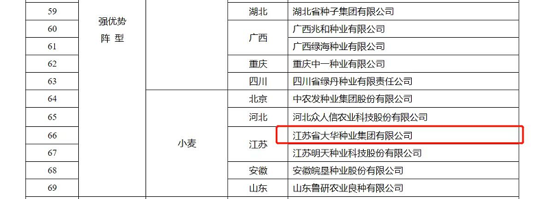 • 為貫徹黨中央、國務院種業振興決策部署,深入實施種業企業扶優行動,近日農業農村部辦公廳印發《關于扶持國家種業陣型企業發展的通知》,根據企業規模、創新能力和發展潛力等關鍵指標,從全國3萬余家種業企業中遴選了69家農作物、86家畜禽、121家水產種業企業機構,集中力量構建“破難題、補短板、強優勢”國家種業企業陣型,加快打造種業振興骨干力量。江蘇省大華種業集團有限公司入選“國家農作物種業陣型企業·強優勢陣型(小麥)”。